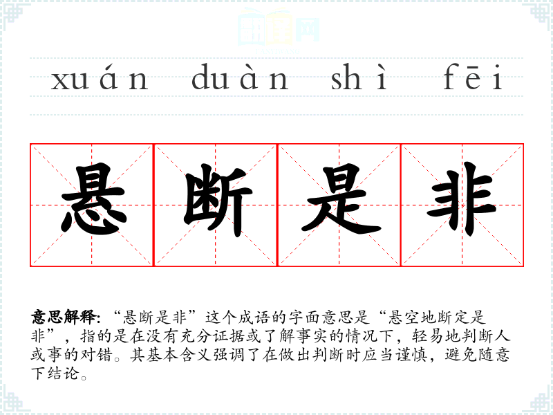 “悬断是非”这个成语的字面意思是“悬空地断定是非”,指的是在没有充分证据或了解事实的情况下,轻易地判断人或事的对错。其基本含义强调了在做出判断时应当谨慎,避免随意下结论。