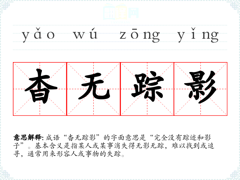 成语“杳无踪影”的字面意思是“完全没有踪迹和影子”。基本含义是指某人或某事消失得无影无踪,难以找到或追寻,通常用来形容人或事物的失踪。