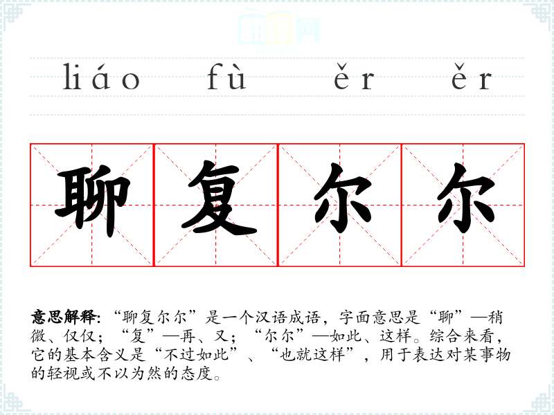 “聊复尔尔”是一个汉语成语,字面意思是“聊”—稍微、仅仅;“复”—再、又;“尔尔”—如此、这样。综合来看,它的基本含义是“不过如此”、“也就这样”,用于表达对某事物的轻视或不以为然的态度。
