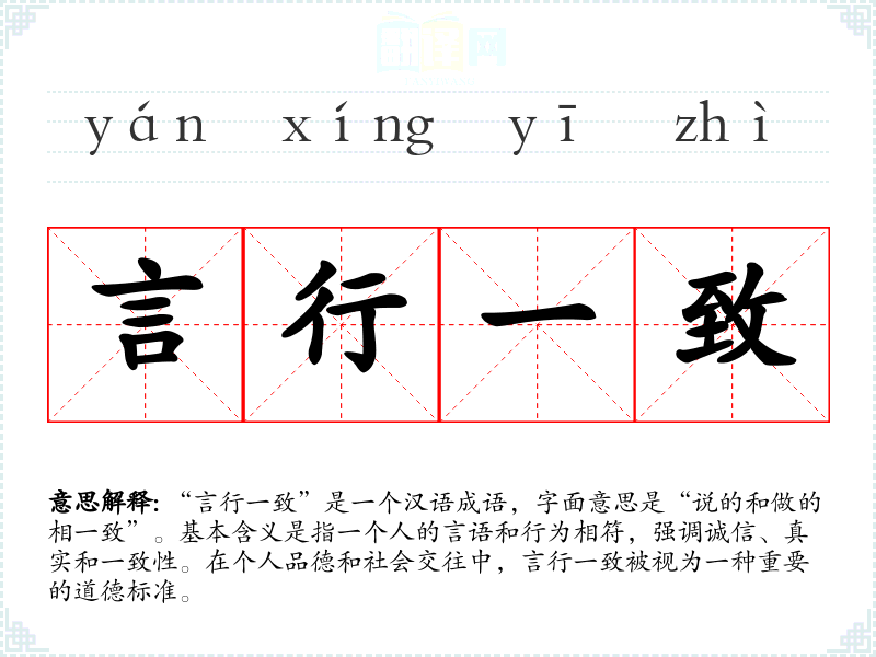 “言行一致”是一个汉语成语,字面意思是“说的和做的相一致”。基本含义是指一个人的言语和行为相符,强调诚信、真实和一致性。在个人品德和社会交往中,言行一致被视为一种重要的道德标准。