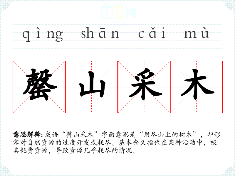 “罄山采木”出自《后汉书·李固传》,其中提到李固为人正直,任职时禁止滥伐树木,维护生态环境。这一成语反映了对资源保护的重视,警示人们要珍惜自然资源。