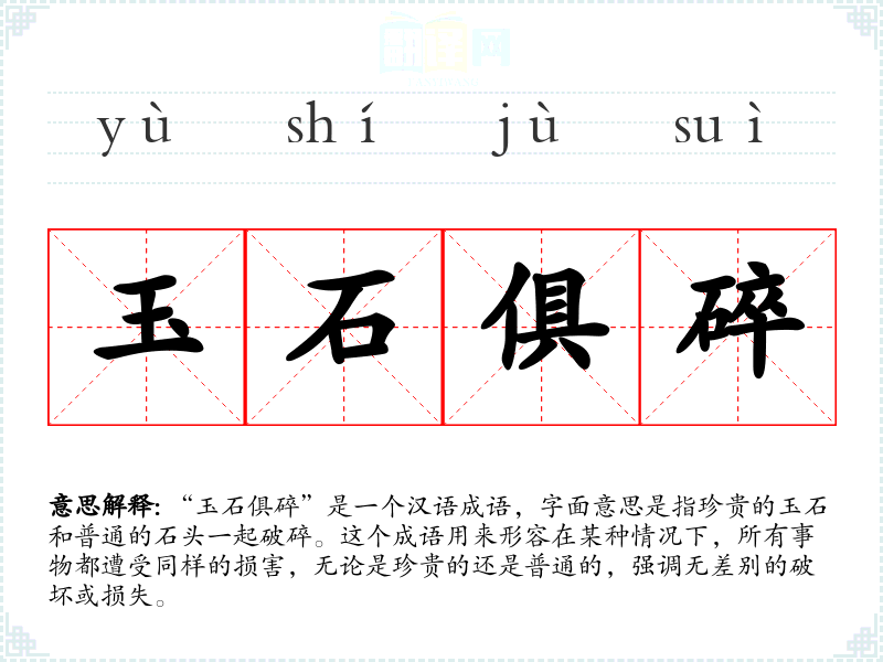 “玉石俱碎”是一个汉语成语,字面意思是指珍贵的玉石和普通的石头一起破碎。这个成语用来形容在某种情况下,所有事物都遭受同样的损害,无论是珍贵的还是普通的,强调无差别的破坏或损失。