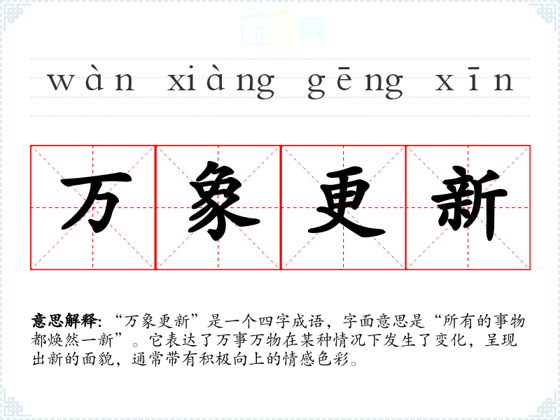 “万象更新”是一个四字成语,字面意思是“所有的事物都焕然一新”。它表达了万事万物在某种情况下发生了变化,呈现出新的面貌,通常带有积极向上的情感色彩。