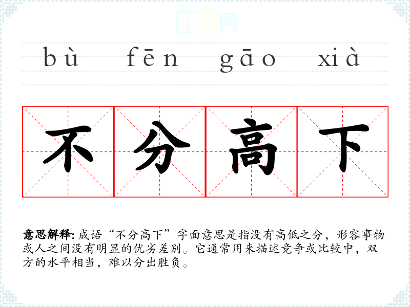 成语“不分高下”字面意思是指没有高低之分,形容事物或人之间没有明显的优劣差别。它通常用来描述竞争或比较中,双方的水平相当,难以分出胜负。