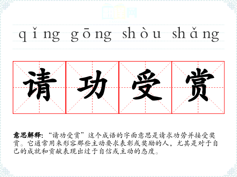 “请功受赏”这个成语的字面意思是请求功劳并接受奖赏。它通常用来形容那些主动要求表彰或奖励的人,尤其是对于自己的成就和贡献表现出过于自信或主动的态度。