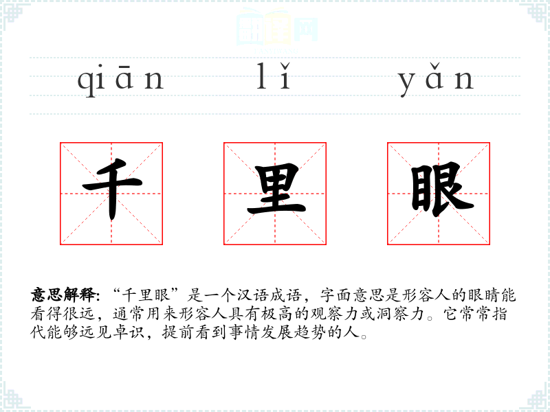 “千里眼”是一个汉语成语,字面意思是形容人的眼睛能看得很远,通常用来形容人具有极高的观察力或洞察力。它常常指代能够远见卓识,提前看到事情发展趋势的人。