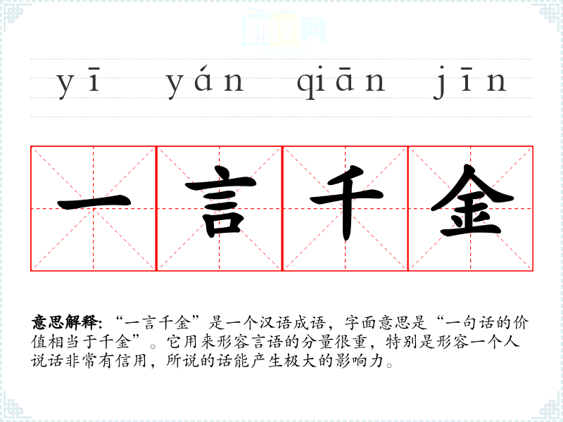 “一言千金”是一个汉语成语,字面意思是“一句话的价值相当于千金”。它用来形容言语的分量很重,特别是形容一个人说话非常有信用,所说的话能产生极大的影响力。