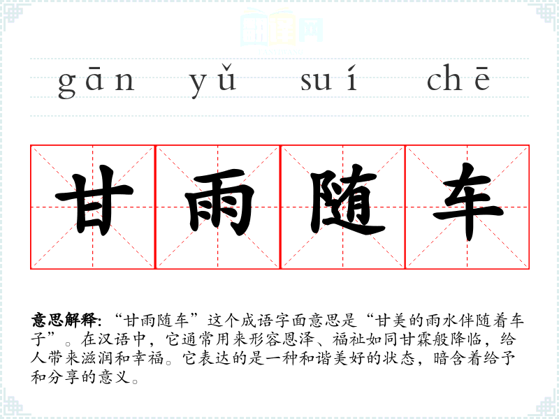 “甘雨随车”出自《诗经》,其原文为“甘雨随车,天之之泽”。这里的“甘雨”指的是滋润的雨水,象征着大自然的恩惠,而“随车”则暗示着这种恩惠伴随着人们的生活。这个成语强调了自然与人之间的和谐关系,以及生活中的美好与丰盈。