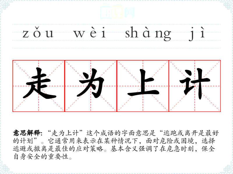 “走为上计”这个成语的字面意思是“逃跑或离开是最好的计划”。它通常用来表示在某种情况下,面对危险或困境,选择逃避或撤离是最佳的应对策略。基本含义强调了在危急时刻,保全自身安全的重要性。