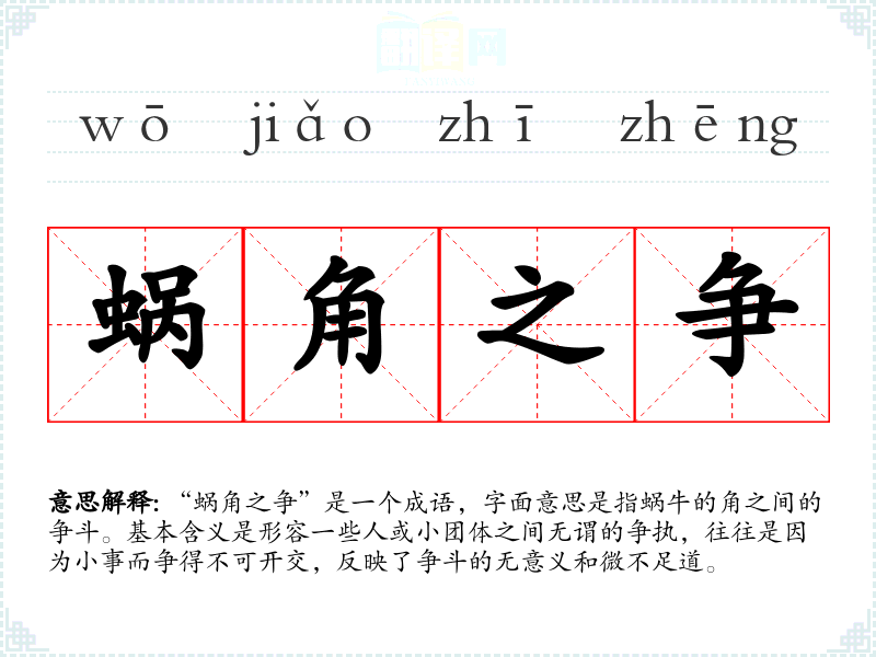 “蜗角之争”是一个成语,字面意思是指蜗牛的角之间的争斗。基本含义是形容一些人或小团体之间无谓的争执,往往是因为小事而争得不可开交,反映了争斗的无意义和微不足道。