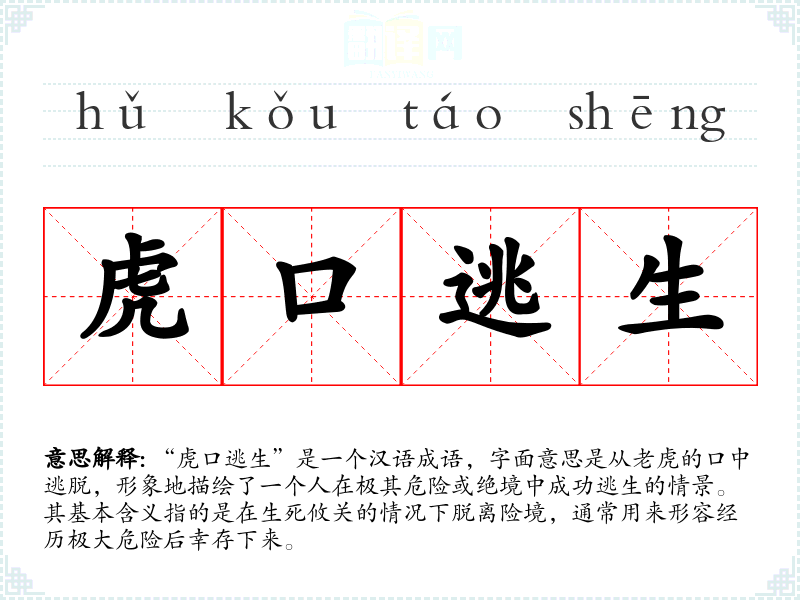 在文化中,通常象征着力量和危险。因此,“虎口逃生”不仅仅是描述一种生存状态,也反映了人们对生命的珍视与对危险的警惕。在现代社会,这个成语依然适用,尤其在面对各种生活挑战时,人们会用此成语来形容自身的经历和情感。