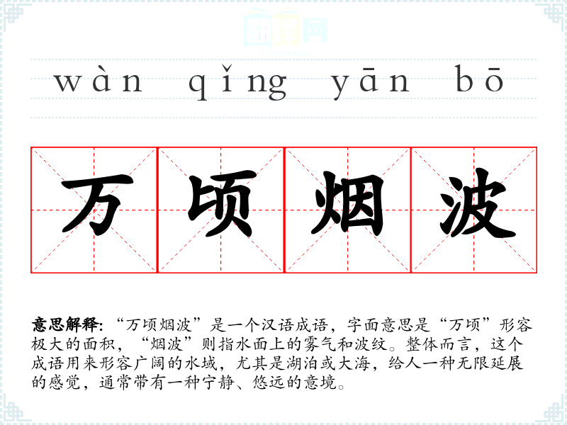 “万顷烟波”是一个汉语成语,字面意思是“万顷”形容极大的面积,“烟波”则指水面上的雾气和波纹。整体而言,这个成语用来形容广阔的水域,尤其是湖泊或大海,给人一种无限延展的感觉,通常带有一种宁静、悠远的意境。