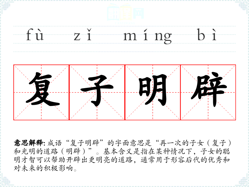 成语“复子明辟”的字面意思是“再一次的子女(复子)和光明的道路(明辟)”。基本含义是指在某种情况下,子女的聪明才智可以帮助开辟出更明亮的道路,通常用于形容后代的优秀和对未来的积极影响。