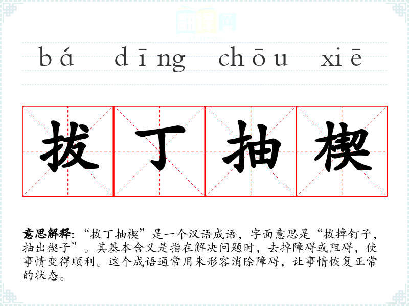 “拔丁抽楔”是一个汉语成语,字面意思是“拔掉钉子,抽出楔子”。其基本含义是指在解决问题时,去掉障碍或阻碍,使事情变得顺利。这个成语通常用来形容消除障碍,让事情恢复正常的状态。