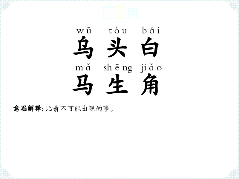 乌鸦变白,马头生角。比喻不能实现之事。 |