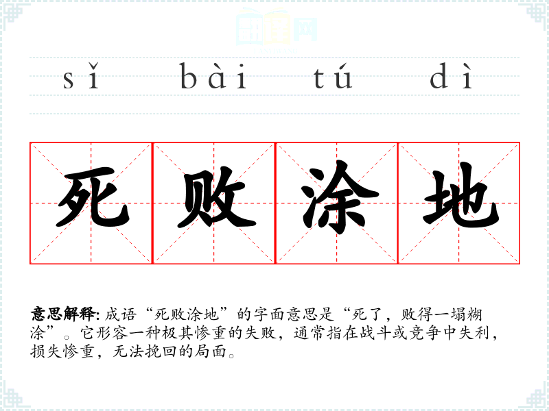 成语“死败涂地”的字面意思是“死了,败得一塌糊涂”。它形容一种极其惨重的失败,通常指在战斗或竞争中失利,损失惨重,无法挽回的局面。
