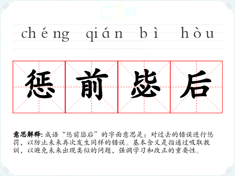 成语“惩前毖后”的字面意思是:对过去的错误进行惩罚,以防止未来再次发生同样的错误。基本含义是指通过吸取教训,以避免未来出现类似的问题,强调学*和改正的重要性。