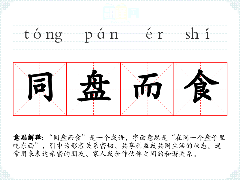 “同盘而食”是一个成语,字面意思是“在同一个盘子里吃东西”,引申为形容关系密切、共享利益或共同生活的状态。通常用来表达亲密的朋友、家人或合作伙伴之间的和谐关系。