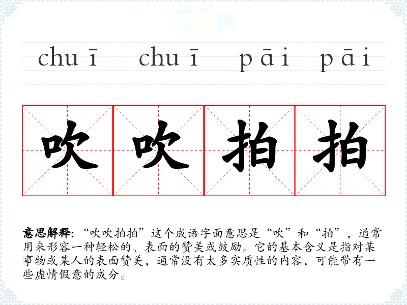 “吹吹拍拍”这个成语字面意思是“吹”和“拍”,通常用来形容一种轻松的、表面的赞美或鼓励。它的基本含义是指对某事物或某人的表面赞美,通常没有太多实质性的内容,可能带有一些虚情假意的成分。