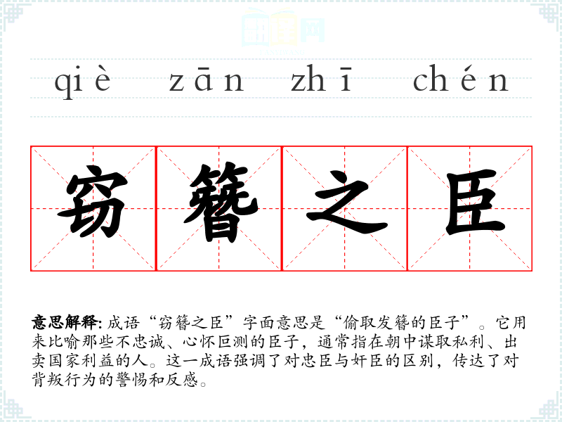 成语“窃簪之臣”字面意思是“偷取发簪的臣子”。它用来比喻那些不忠诚、心怀叵测的臣子,通常指在朝中谋取私利、出卖国家利益的人。这一成语强调了对忠臣与奸臣的区别,传达了对背叛行为的警惕和反感。