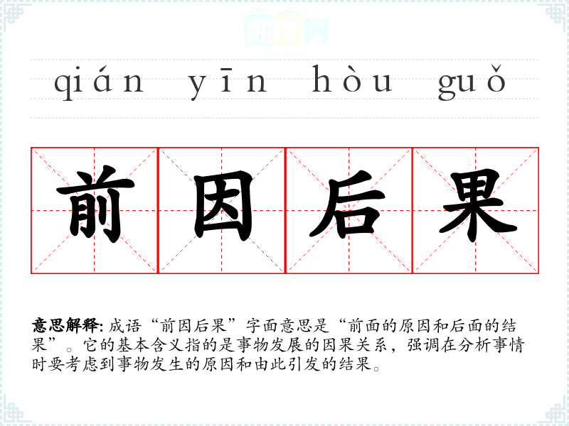 成语“前因后果”字面意思是“前面的原因和后面的结果”。它的基本含义指的是事物发展的因果关系,强调在分析事情时要考虑到事物发生的原因和由此引发的结果。