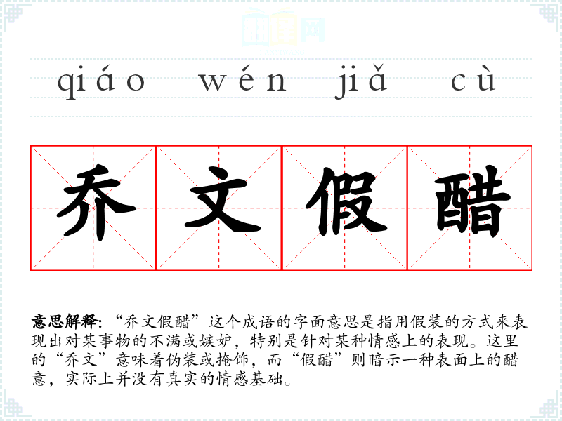 “乔文假醋”这个成语的字面意思是指用假装的方式来表现出对某事物的不满或嫉妒,特别是针对某种情感上的表现。这里的“乔文”意味着伪装或掩饰,而“假醋”则暗示一种表面上的醋意,实际上并没有真实的情感基础。