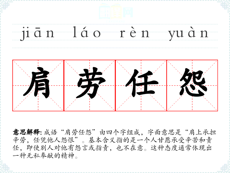 成语“肩劳任怨”由四个字组成,字面意思是“肩上承担辛劳,任凭他人怨恨”。基本含义指的是一个人甘愿承受辛苦和责任,即使别人对他有怨言或指责,也不在意。这种态度通常体现出一种无私奉献的精神。