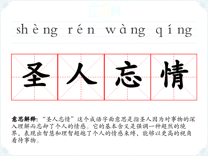“圣人忘情”这个成语字面意思是指圣人因为对事物的深入理解而忘却了个人的情感。它的基本含义是强调一种超然的境界,表现出智慧和理智超越了个人的情感束缚,能够以更高的视角看待事物。