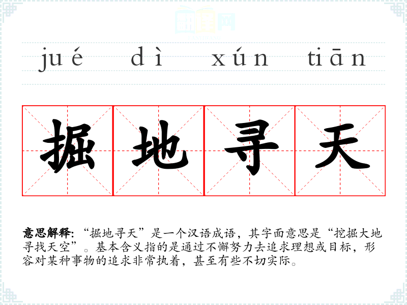 “掘地寻天”是一个汉语成语,其字面意思是“挖掘大地寻找天空”。基本含义指的是通过不懈努力去追求理想或目标,形容对某种事物的追求非常执着,甚至有些不切实际。