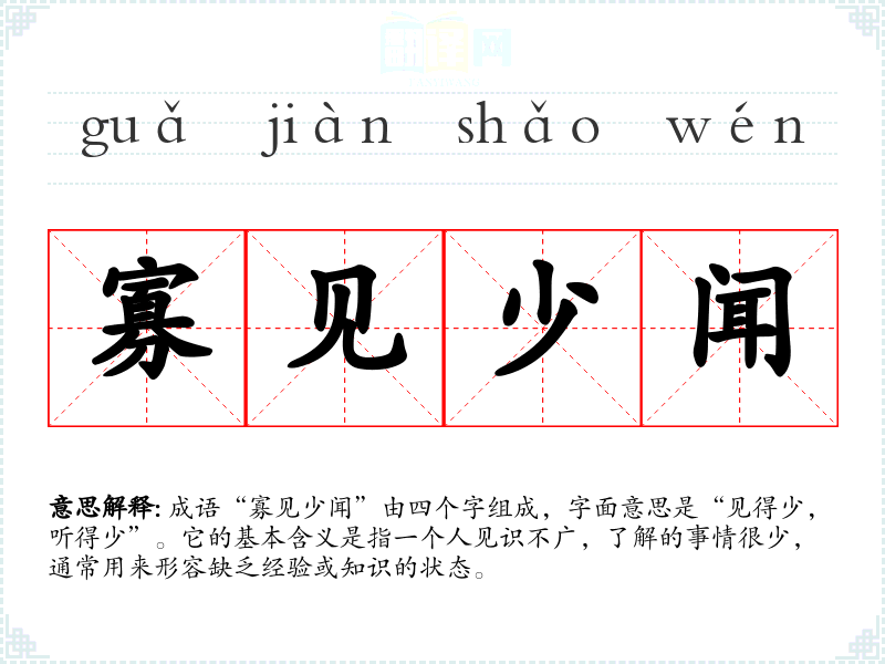 成语“寡见少闻”由四个字组成,字面意思是“见得少,听得少”。它的基本含义是指一个人见识不广,了解的事情很少,通常用来形容缺乏经验或知识的状态。