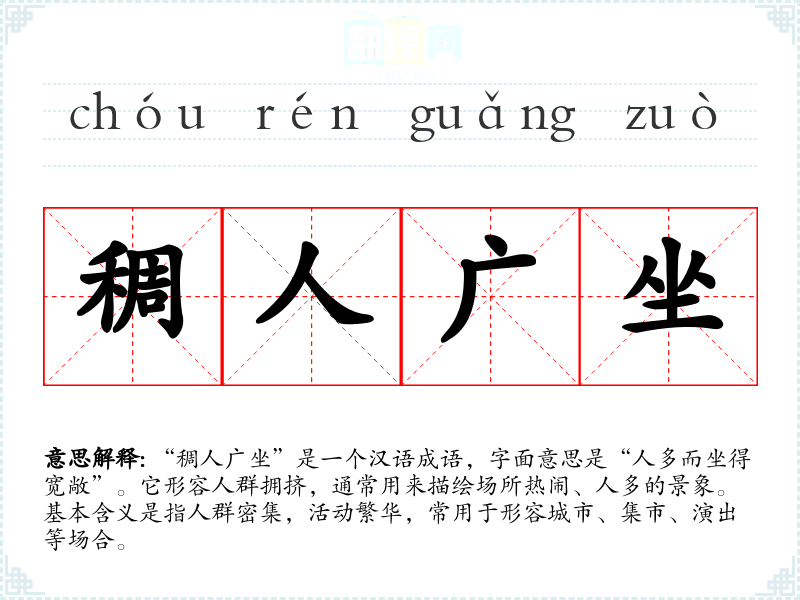 “稠人广坐”是一个汉语成语,字面意思是“人多而坐得宽敞”。它形容人群拥挤,通常用来描绘场所热闹、人多的景象。基本含义是指人群密集,活动繁华,常用于形容城市、集市、演出等场合。