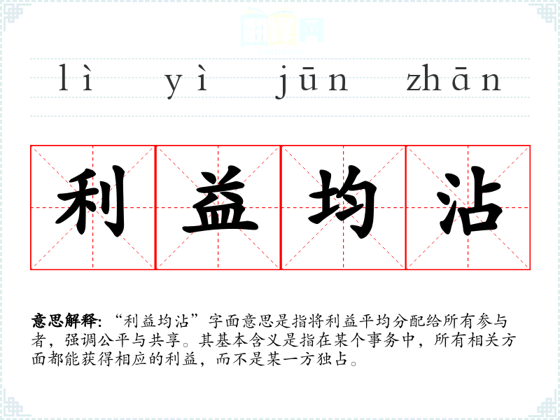 “利益均沾”并没有特定的历史典故或文学出处,它是现代汉语中一个常用的成语,反映了社会对公平分配的追求和重视。这个成语的形成与经济、社会关系的变化密切相关,尤其是现代社会对资源分配与合作共赢理念的重视。