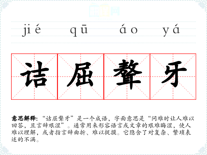 “诘屈聱牙”是一个成语,字面意思是“问难时让人难以回答,且言辞艰涩”。通常用来形容语言或文章的艰难晦涩,使人难以理解,或者指言辞曲折、难以捉摸。它隐含了对复杂、繁琐表述的不满。