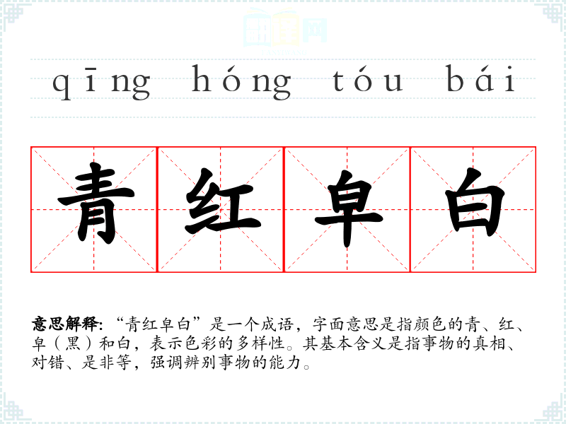 “青红皁白”是一个成语,字面意思是指颜色的青、红、皁(黑)和白,表示色彩的多样性。其基本含义是指事物的真相、对错、是非等,强调辨别事物的能力。