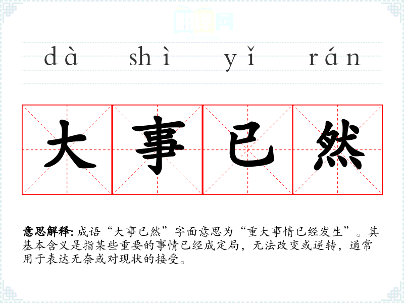 成语“大事已然”字面意思为“重大事情已经发生”。其基本含义是指某些重要的事情已经成定局,无法改变或逆转,通常用于表达无奈或对现状的接受。