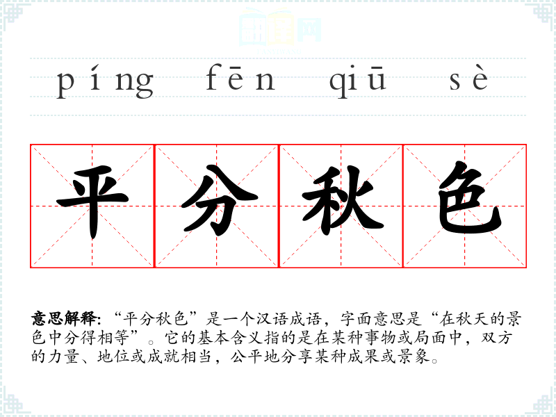“平分秋色”是一个汉语成语,字面意思是“在秋天的景色中分得相等”。它的基本含义指的是在某种事物或局面中,双方的力量、地位或成就相当,公平地分享某种成果或景象。