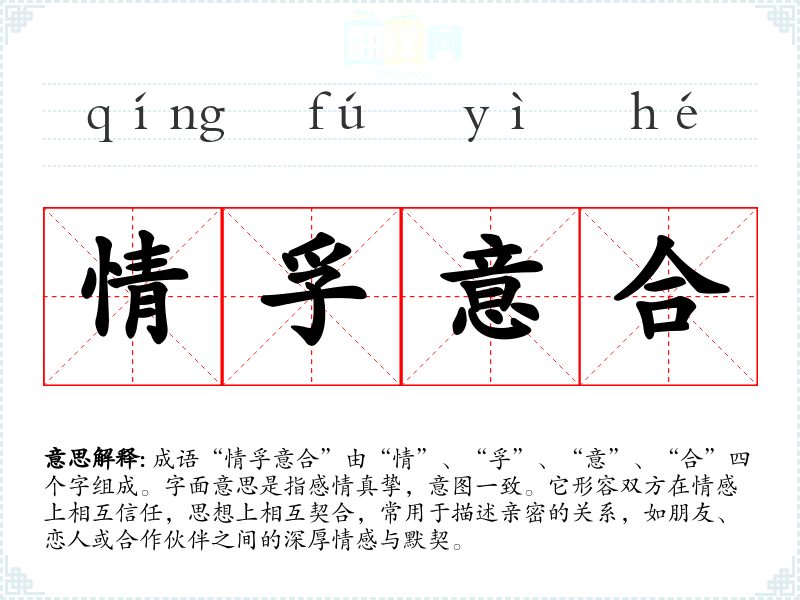 成语“情孚意合”由“情”、“孚”、“意”、“合”四个字组成。字面意思是指感情真挚,意图一致。它形容双方在情感上相互信任,思想上相互契合,常用于描述亲密的关系,如朋友、恋人或合作伙伴之间的深厚情感与默契。