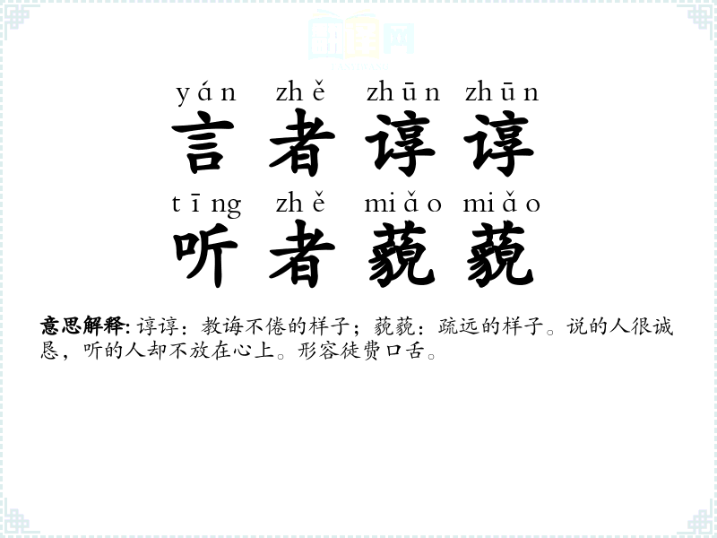 谆谆:教诲不倦的样子;藐藐:疏远的样子。说的人很诚恳,听的人却不放在心上。形容徒费口舌。 |