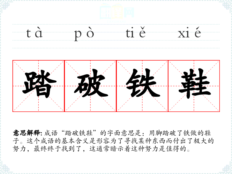 成语“踏破铁鞋”的字面意思是:用脚踏破了铁做的鞋子。这个成语的基本含义是形容为了寻找某种东西而付出了极大的努力,最终终于找到了,这通常暗示着这种努力是值得的。