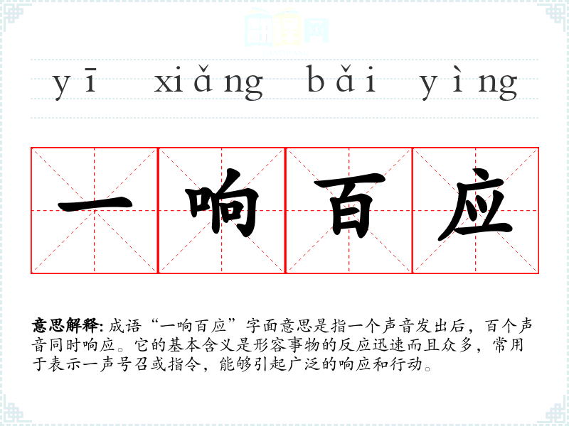 成语“一响百应”字面意思是指一个声音发出后,百个声音同时响应。它的基本含义是形容事物的反应迅速而且众多,常用于表示一声号召或指令,能够引起广泛的响应和行动。