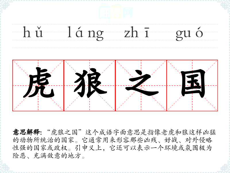 在**传统文化中,虎和狼这类动物常常被视为坏事的象征,代表着对外的威胁与侵略。因此,“虎狼之国”在社会背景中,常常与历史上的战争、侵略联系在一起。现代社会中,这个成语仍然适用,尤其是在国际关系和地缘政治的讨论中。