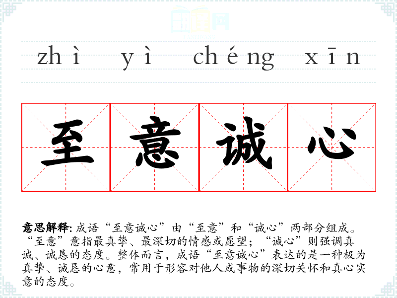 成语“至意诚心”由“至意”和“诚心”两部分组成。“至意”意指最真挚、最深切的情感或愿望;“诚心”则强调真诚、诚恳的态度。整体而言,成语“至意诚心”表达的是一种极为真挚、诚恳的心意,常用于形容对他人或事物的深切关怀和真心实意的态度。