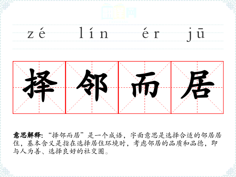 “择邻而居”是一个成语,字面意思是选择合适的邻居居住,基本含义是指在选择居住环境时,考虑邻居的品质和品德,即与人为善、选择良好的社交圈。
