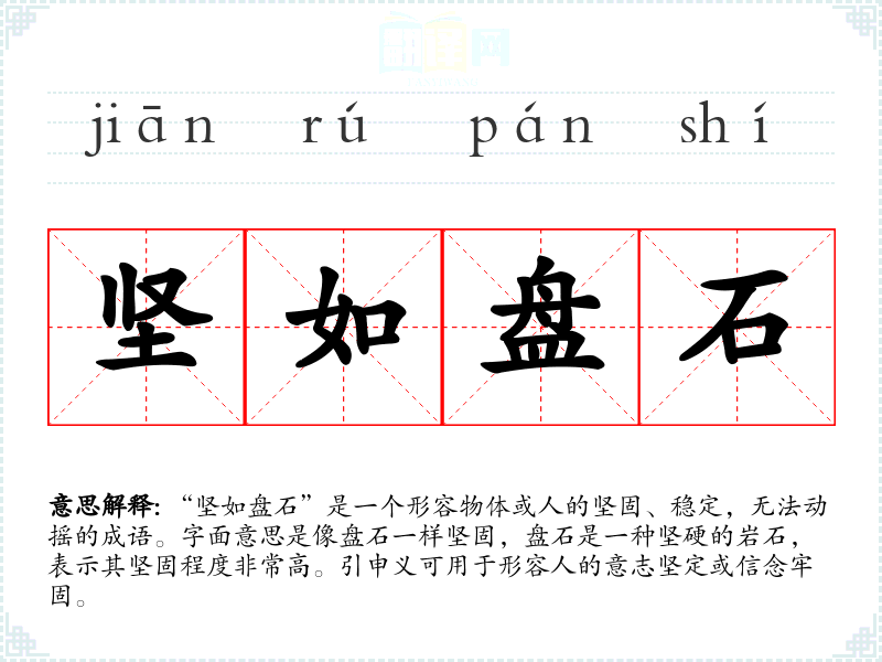 - 文学作品:可用于描写人物性格,例如“他的意志坚如盘石,面对困难从不退缩”。