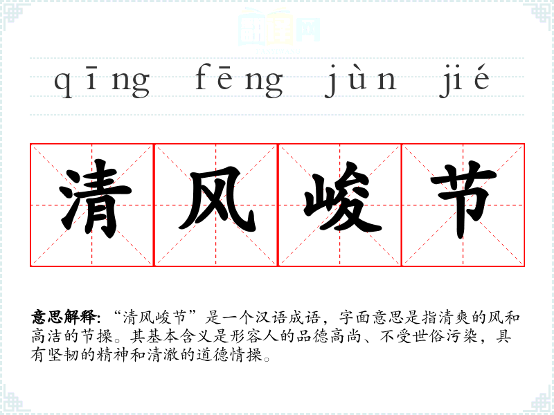 “清风峻节”是一个汉语成语,字面意思是指清爽的风和高洁的节操。其基本含义是形容人的品德高尚、不受世俗污染,具有坚韧的精神和清澈的道德情操。