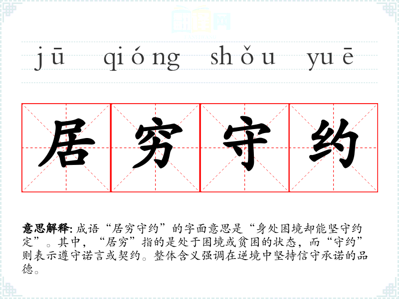 成语“居穷守约”的字面意思是“身处困境却能坚守约定”。其中,“居穷”指的是处于困境或贫困的状态,而“守约”则表示遵守诺言或契约。整体含义强调在逆境中坚持信守承诺的品德。
