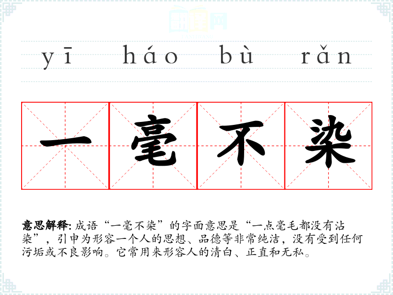 成语“一毫不染”的字面意思是“一点毫毛都没有沾染”,引申为形容一个人的思想、品德等非常纯洁,没有受到任何污垢或不良影响。它常用来形容人的清白、正直和无私。