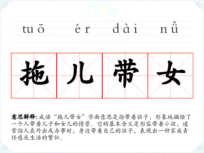 成语“拖儿带女”字面意思是指带着孩子,形象地描绘了一个人带着儿子和女儿的情景。它的基本含义是形容带着小孩,通常指人在外出或办事时,身边带着自己的孩子,表现出一种家庭责任感或生活的繁忙。