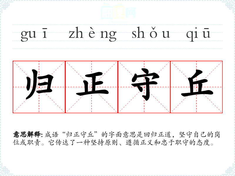 成语“归正守丘”的字面意思是回归正道,坚守自己的岗位或职责。它传达了一种坚持原则、遵循正义和忠于职守的态度。