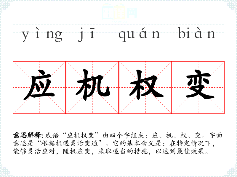 成语“应机权变”由四个字组成:应、机、权、变。字面意思是“根据机遇灵活变通”。它的基本含义是:在特定情况下,能够灵活应对,随机应变,采取适当的措施,以达到最佳效果。